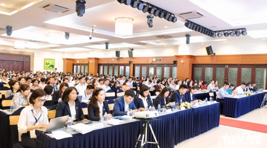 Đại diện lãnh đạo cơ quan quản lý thị trường chứng khoán cùng hơn 500 đại biểu đến từ công ty đại chúng, công ty niêm yết, công ty chứng khoán, quỹ đầu tư, hãng kiểm toán... tham dự hội nghị cập nhật quy định pháp luật mới về chứng khoán - Ảnh: BÔNG MAI