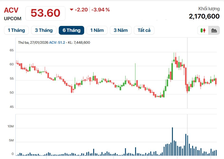 Phản ứng với các thông tin vĩ mô và nội tại, thị giá cổ phiếu ACV trên sàn UPCoM hiện giao dịch quanh mốc 56.000 đồng, biên độ tăng đạt 15% kể từ đầu năm.