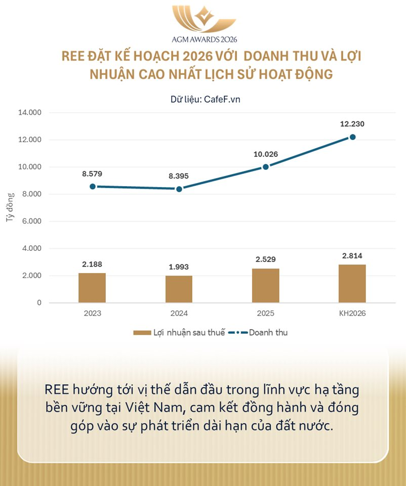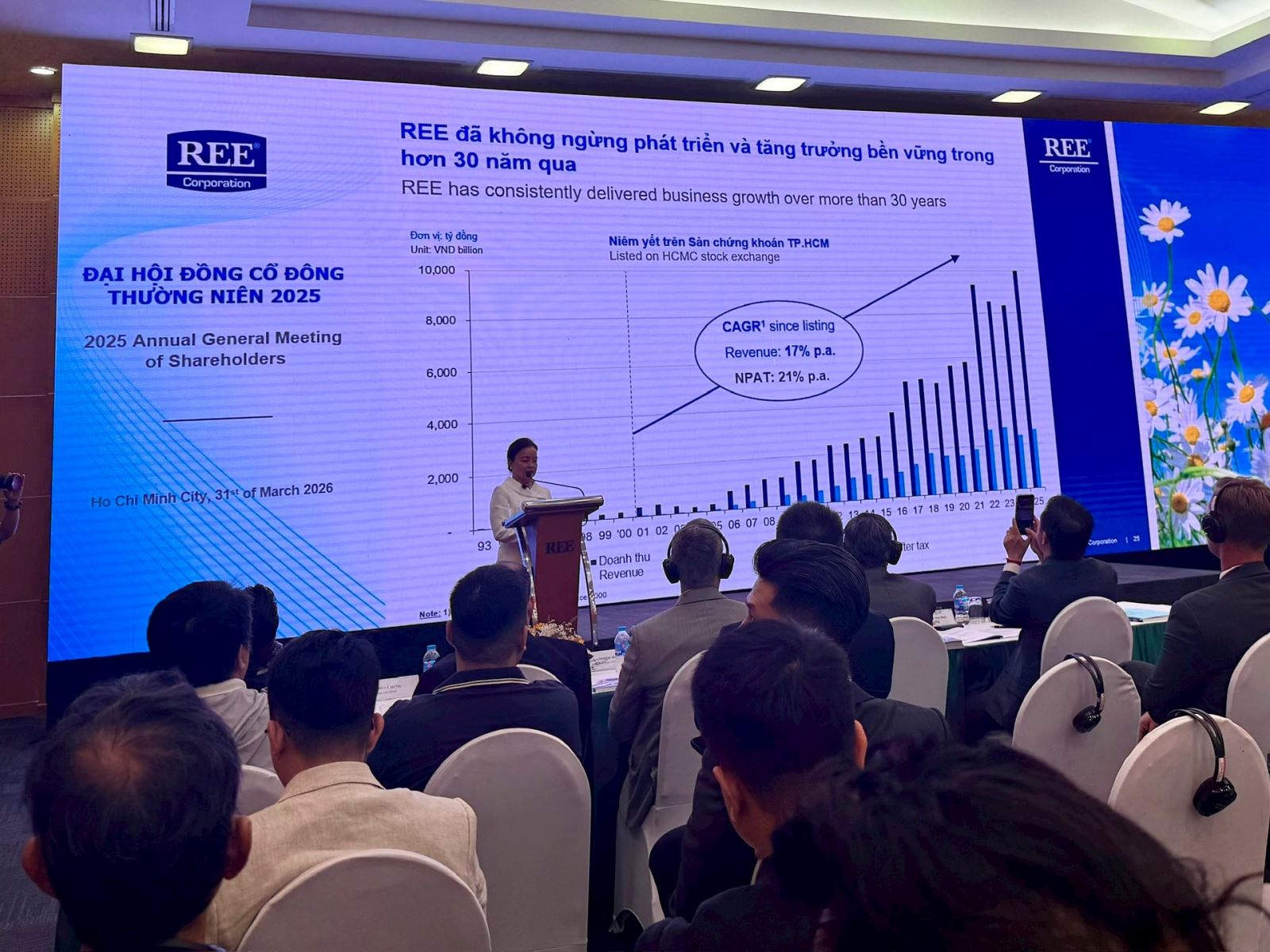 Sáng 31/03/2026, Công ty Cổ phần Cơ Điện Lạnh (REE) tổ chức Đại hội đồng cổ đông, trình kế hoạch doanh thu kỷ lục 12.230 tỷ đồng và lợi nhuận sau thuế 2.814 tỷ đồng.