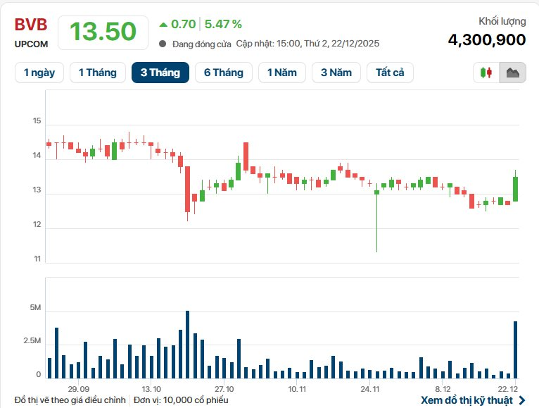 Cụ thể, kết phiên 22/12, giá cổ phiếu BVB ở mức 13.500 đồng/cổ phiếu, tăng 5,47% so với phiên trước, khối lượng cổ phiếu giao dịch khớp lệnh tăng đột biến lên hơn 4,3 triệu đơn vị - tăng hơn 10 lần so với phiên trước.