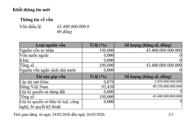 Vốn điều lệ của công ty tăng 10% từ 39.500 tỷ đồng lên 43.400 tỷ đồng, tương ứng tăng thêm 3.900 tỷ đồng. Toàn bộ số vốn là tư nhân, gồm tiền Đồng Việt Nam và các tài sản khác.