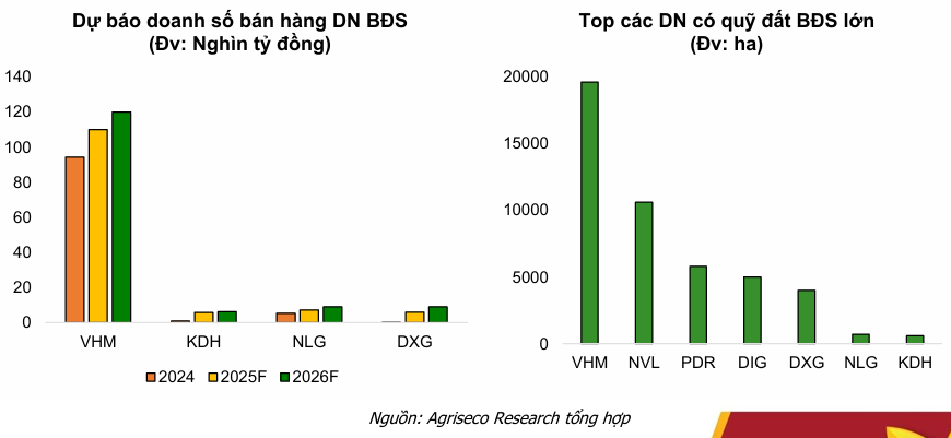 "Cơ hội đầu tư tập trung ở các doanh nghiệp quỹ đất sạch, năng lực triển khai tốt và hưởng lợi từ chính sách pháp lý, trong bối cảnh rủi ro ngắn hạn đến từ áp lực chốt lời sau nhịp tăng mạnh và tiến độ giải ngân dự án.", báo cáo của Agriseco nhấn mạnh.