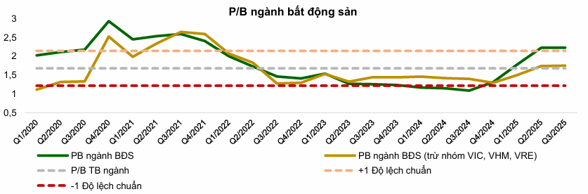 Mặt bằng định giá của nhóm bất động sản đang giao dịch ở mức P/B 2,2 lần, cao hơn mức bình quân 5 năm quá khứ (1,8 lần) và tiệm cận vùng +1 độ lệch chuẩn. Tuy nhiên, nếu loại trừ các cổ phiếu vốn hóa lớn (VIC, VHM, VRE), P/B ngành chỉ quanh 1,7 lần, tương đương mức trung bình dài hạn. Điều này cho thấy mặt bằng định giá chung của phần lớn doanh nghiệp bất động sản vẫn ở vùng hợp lý so với quá khứ.