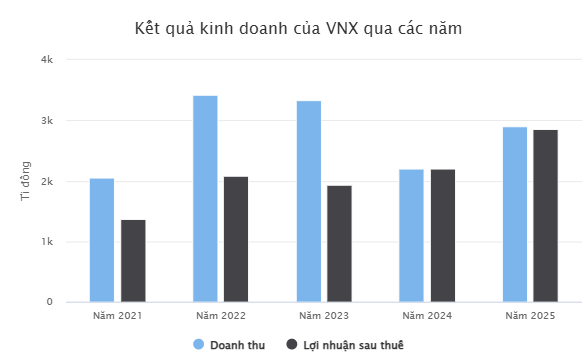 Lũy kế cả năm 2025, VNX ghi nhận tổng doanh thu hơn 2.905 tỉ đồng, tăng 30% so với năm trước. Lợi nhuận sau thuế đạt gần 2.850 tỉ đồng, tăng 29% và vượt khoảng 29% kế hoạch năm.