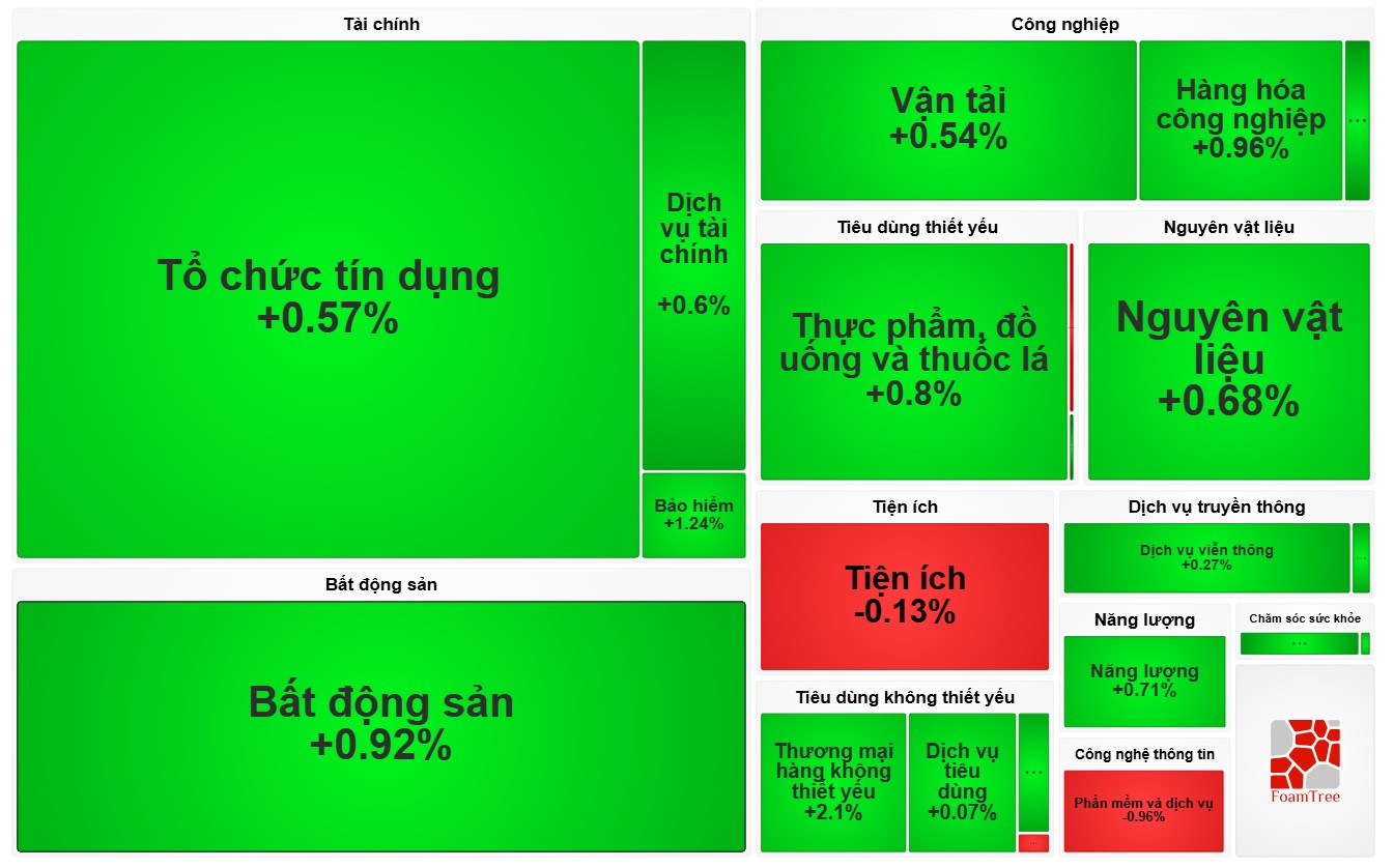 Nhiều lĩnh vực chuyển màu từ đỏ sang xanh vào cuối phiên, độ rộng thị trường có 181 mã xanh, trong khi 121 mã đỏ trên sàn HOSE. Nguồn: Vietstock