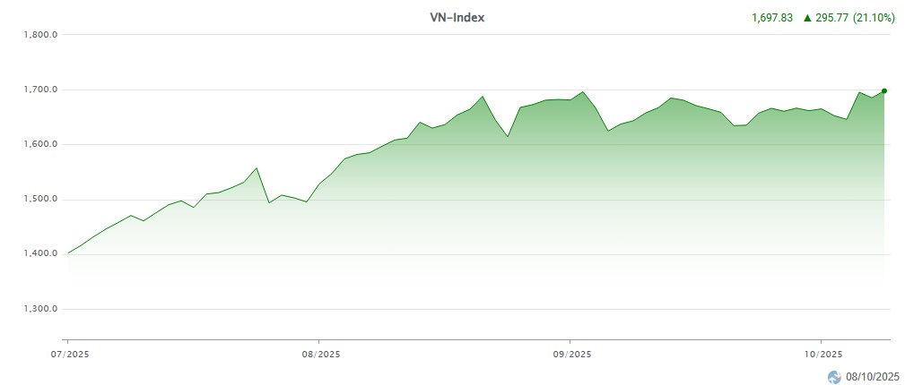 Kết phiên hôm nay, chỉ số VN-Index tăng 12,53 điểm, tương đương 0,74%, đạt mức 1697,83 điểm. Đây cũng là mức điểm đóng cửa cao nhất lịch sử, phiên gần nhất trước là ngày 4-9 (1.696,29 điểm). Thị trường hôm 6-10, tức phiên có các cổ phiếu chứng khoán đồng loạt tăng trần, cũng đã đóng cửa ở trên 1.695 điểm.