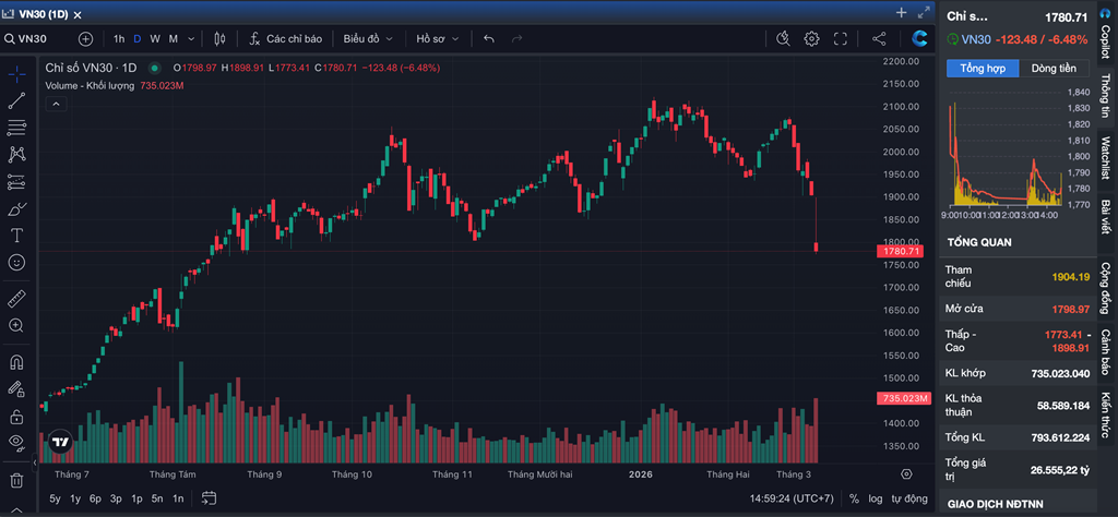Thị trường chứng khoán Việt Nam chứng kiến phiên giảm sâu trong sáng 9/3 khi VN-Index mất hơn 6% giá trị chỉ sau vài giờ giao dịch. Theo các chuyên gia, cú lao dốc này chịu tác động lớn từ những bất ổn địa chính trị và đà tăng của giá dầu toàn cầu. Tuy vậy, nhà đầu tư được khuyến nghị giữ bình tĩnh, ưu tiên kiểm soát rủi ro và không nên bán tháo cổ phiếu chất lượng trong danh mục.