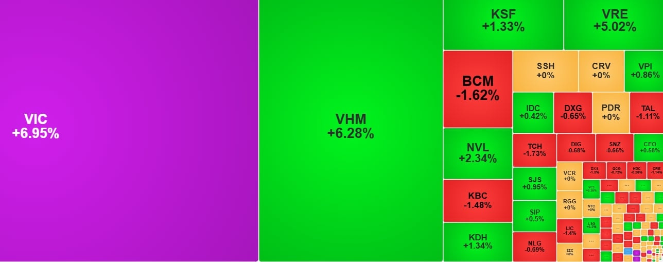 Nhóm cổ phiếu bất động sản diễn biến tích cực nhất. Các mã thuộc Vingroup gồm VIC, VHM, VRE đóng góp tổng cộng hơn 28 điểm cho VN-Index. Trong đó, riêng VIC tăng kịch trần, đóng góp gần 20 điểm; VHM đóng góp 7,43 điểm, VRE đóng góp 0,7 điểm. Ngoài ra, VPL cũng hỗ trợ thêm 1,58 điểm.