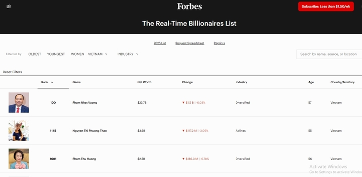 Tài sản của bà Nguyễn Thị Phương Thảo - Chủ tịch Vietjet - giảm 117,2 triệu USD (-3,09%), xuống còn 3,6 tỷ USD, xếp thứ 1.145 thế giới.
