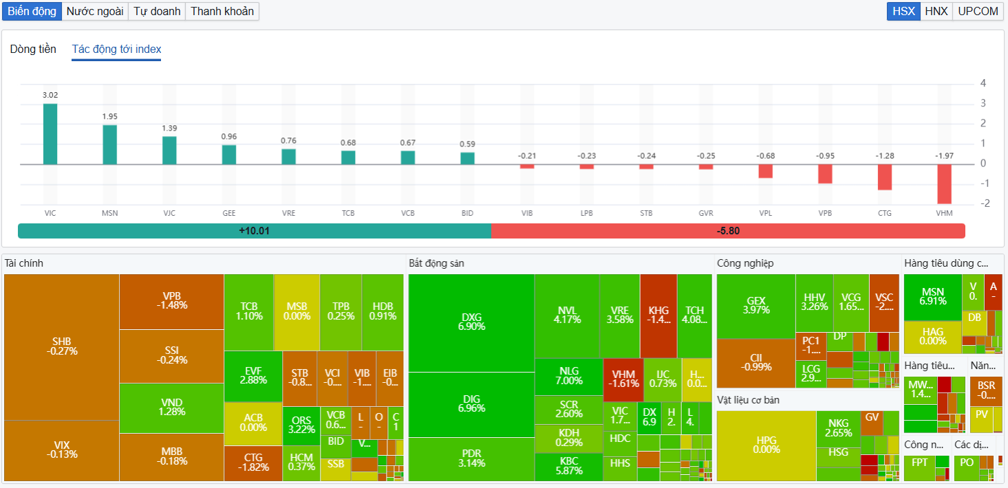 Đặc biệt, đà tăng của VIC trong những phút cuối phiên đã đẩy VN-Index đóng cửa gần mức cao nhất trong phiên. Khối ngoại đảo chiều mua ròng mạnh mẽ trong phiên chiều, đạt giá trị ròng 527,2 tỉ đồng, tập trung vào các mã NLG, DXG và GEX.