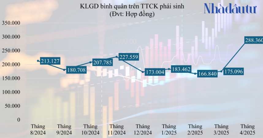 Thống kê của Nhadautu.vn cũng chỉ ra, khối lượng giao dịch bình quân của các hợp đồng phái sinh (tính đến phiên 15/4) là hơn 288.360 hợp đồng/phiên, cao hơn hẳn xét từ giai đoạn tháng 10/2024 trở lại đây. Điều này phần nào minh chứng dòng tiền của nhà đầu tư đã chuyển dịch sang thị trường này.