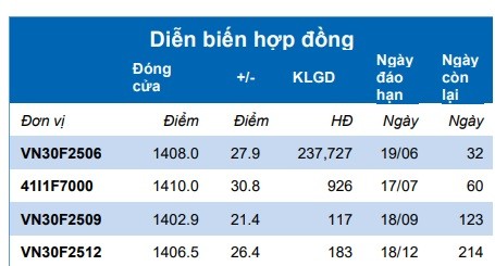 Hợp đồng tháng VN30F2506 đóng cửa tại 1.408 điểm, tăng +27,9 điểm so với phiên trước. Mức tăng của hợp đồng này lớn hơn mức tăng của chỉ số cơ sở, nên khoảng cách chênh lệch vẫn giữ ở mức dương với mức +0,48 điểm.