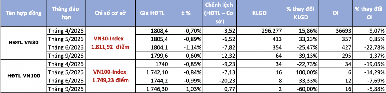 Hợp đồng tương lai dựa trên VN30 đáo hạn tháng gần nhất (41I1G4000) đóng cửa tại 1.808,4 điểm, giảm 0,7%. Mức giảm sâu hơn này đã kéo chênh lệch âm mở rộng lên -3,52 điểm so với chỉ số cơ sở. Các hợp đồng kỳ hạn xa hơn cũng đồng loạt duy trì chênh lệch âm sâu, dao động từ -6,52 điểm đến -12,32 điểm, phản ánh kỳ vọng ngắn hạn vẫn nghiêng về khả năng điều chỉnh tiếp diễn.
