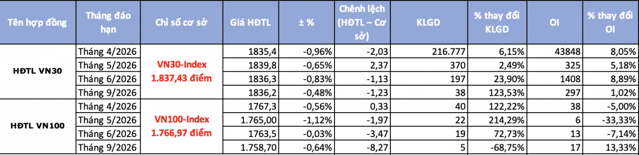 Kết phiên, hợp đồng tương lai VN30 tháng gần VN30F2604 đóng cửa tại 1.835,4 điểm, giảm 0,96% so với phiên trước và thấp hơn chỉ số cơ sở khoảng 2,03 điểm, qua đó chuyển sang trạng thái chênh lệch âm. Dù chênh lệch dương vẫn duy trì ở một số hợp đồng như hợp đồng tương lai VN30 dáo hạn vào tháng 5/2026, đa số hợp đồng tương lai phái sinh đóng cửa tuần đầu tiên của tháng ở trạng thái âm. Tâm lý nhà đầu tư thận trọng hơn khi thị trường cơ sở suy yếu rõ rệt trong phiên chiều.