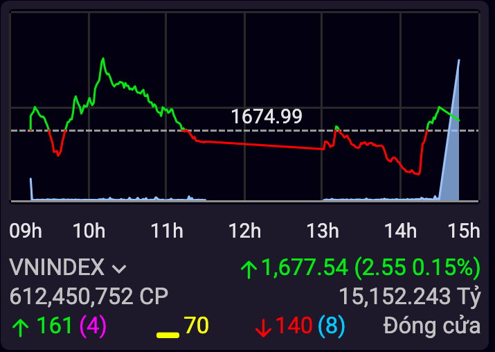Bước sang phiên chiều, áp lực bán gia tăng nhẹ khiến VN-Index có thời điểm lùi xuống dưới tham chiếu. Tuy nhiên, điểm đáng chú ý nằm ở nhịp “bù giờ” cuối phiên, khi lực cầu bất ngờ nhập cuộc, kéo nhiều cổ phiếu quay đầu tăng giá. Nhịp hồi này tuy không quá mạnh nhưng đủ để đưa VN-Index đóng cửa tại 1.677,54 điểm, tăng 2,55 điểm (+0,15%) trong sự bất ngờ của giới đầu tư.