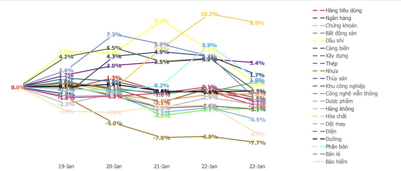 Theo thống kê của Công ty Chứng khoán Kirin, các nhóm cổ phiếu dẫn đầu đà giảm trong tuần qua chủ yếu là nhóm vốn hóa vừa, từng tăng mạnh trước như nhóm dệt may (-4,48%), bảo hiểm (-6,21%) hay nhựa (-7,68%). Ở chiều ngược lại, nhóm hóa chất bất ngờ trở thành điểm sáng hiếm hoi, đánh dấu sự hồi phục sau nhiều tuần tạo đáy.