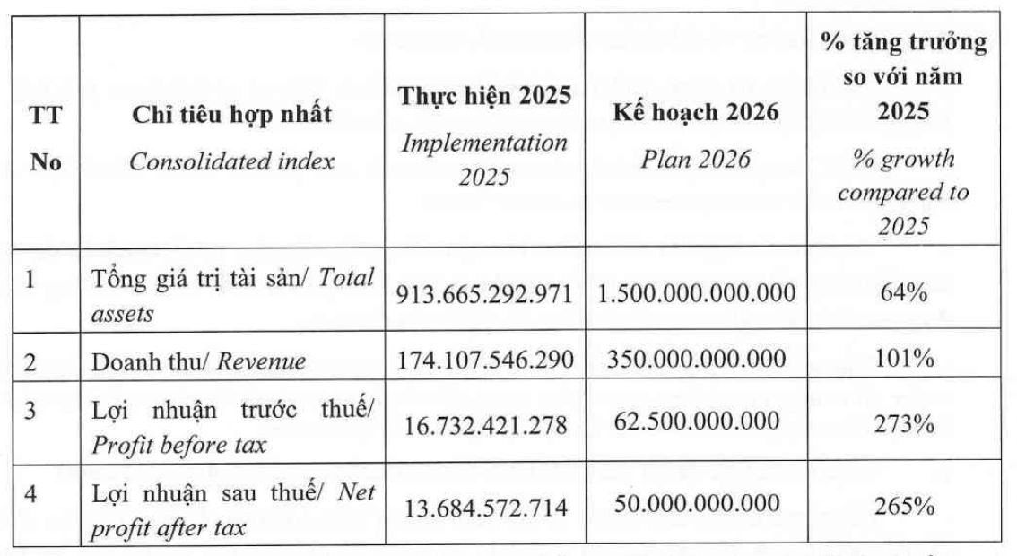 Song song với đó, công ty đặt mục tiêu nâng tổng tài sản lên 1.500 tỷ đồng trong năm 2026, tăng khoảng 64% so với cuối năm 2025.