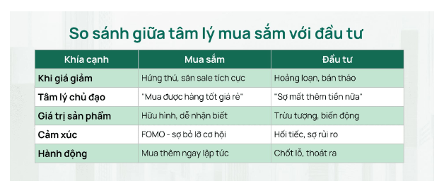 Quỹ ngoại lý giải, trong mua sắm, hàng hóa giảm giá được xem là cơ hội mang lại lợi ích rõ ràng, kích thích sự hứng thú “săn sale”. Ngược lại, trong đầu tư, khi thị trường sụt giảm, tổn thất tài chính trừu tượng lại kích hoạt các vùng não bộ tương tự như khi chịu đau đớn thể chất. Phản ứng sinh tồn này khiến nhà đầu tư rơi vào trạng thái “chiến đấu hoặc bỏ chạy”, dẫn đến bán tháo tài sản để thoát khỏi cảm giác đau đớn ngắn hạn.