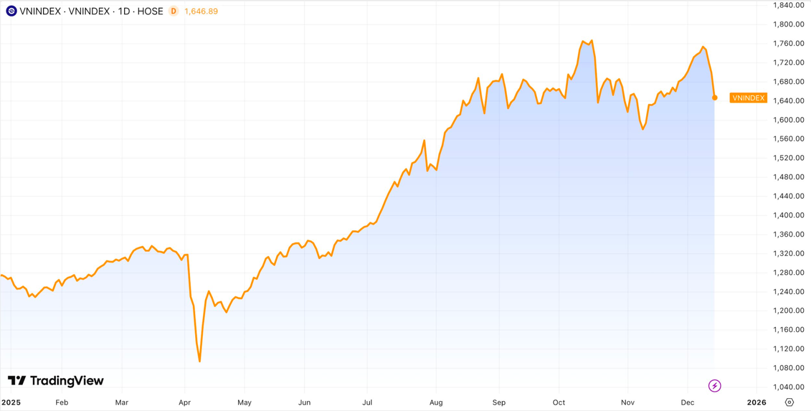 VN-Index đóng cửa giảm 52 điểm (-3,06%) xuống dưới mốc 1.650 điểm. Con số này đưa chứng khoán Việt Nam trở thành thị trường giảm mạnh nhất Châu Á phiên 12/12, thậm chí còn đi ngược xu hướng chung của khu vực.