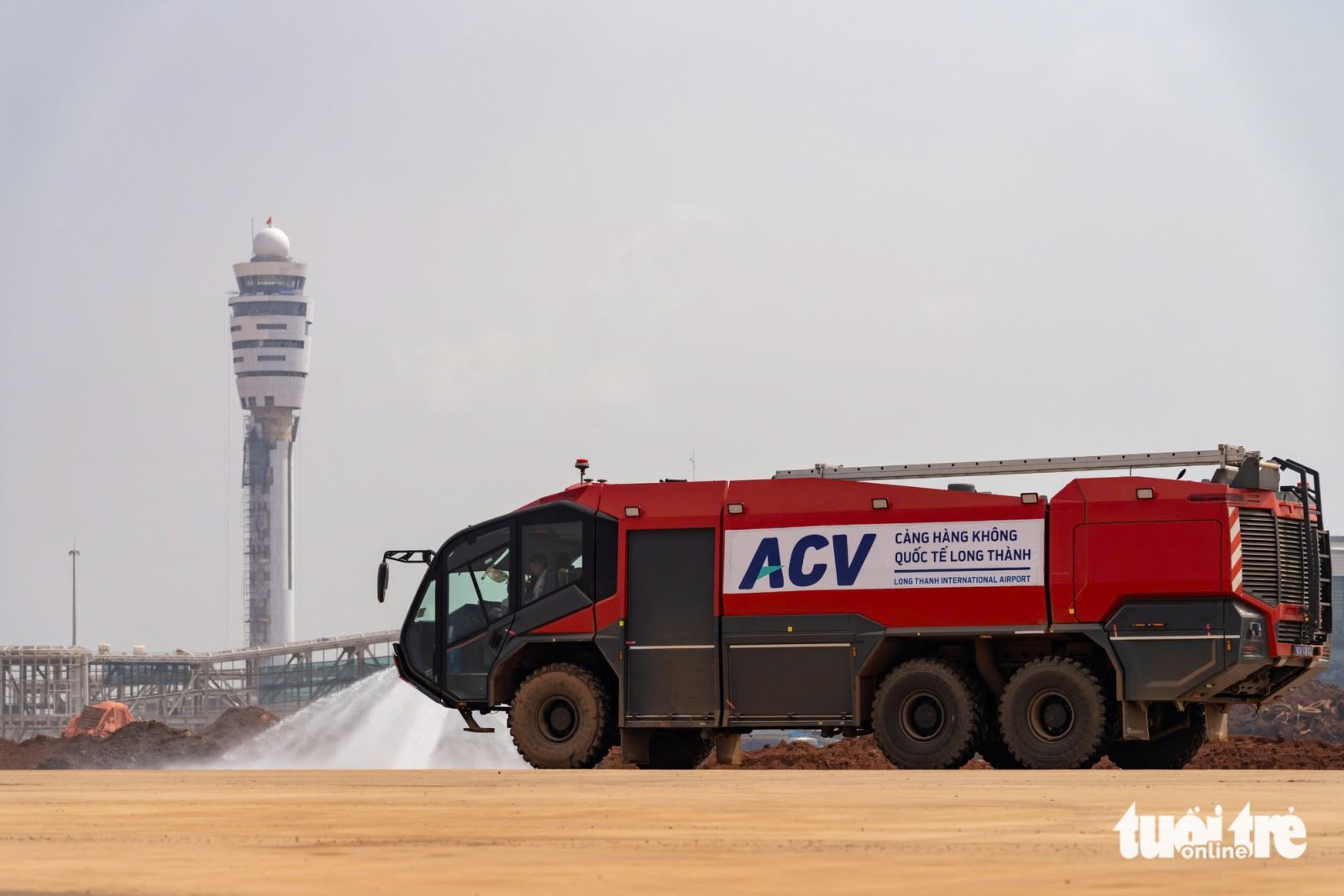 Máy phun tưới nước trên đường cất hạ cánh số 1 Cảng hàng không quốc tế Long Thành - Ảnh: VĂN TRUNG