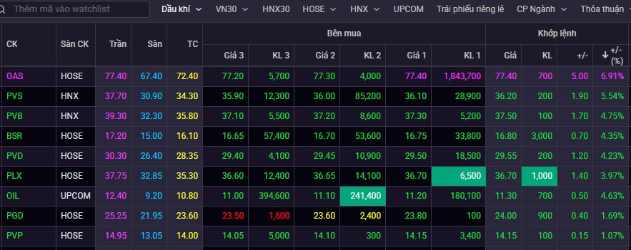 Đáng chú ý, dòng tiền đổ dồn vào cổ phiếu Tổng Công ty Khí Việt Nam – CTCP (PV GAS, mã: GAS). Lực mua áp đảo đẩy thị giá nhuộm “sắc tím” và ghi nhận tình trạng trắng bên bán. Nhờ đó, cổ phiếu dầu khí này tăng vọt lên mốc 77.400 đồng/cp cùng lượng dư mua giá trần đạt hàng triệu đơn vị.