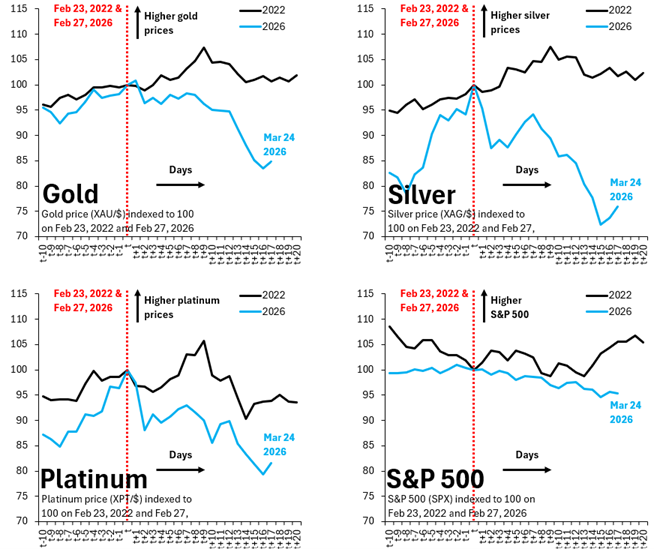 Brooks đã chia sẻ bốn biểu đồ cho thấy diễn biến giá của vàng, bạc, bạch kim và chỉ số S&P 500 kể từ khi bắt đầu cuộc xung đột Iran, kết hợp với hiệu suất của các tài sản này sau cuộc xung đột Nga - Ukraine năm 2022.