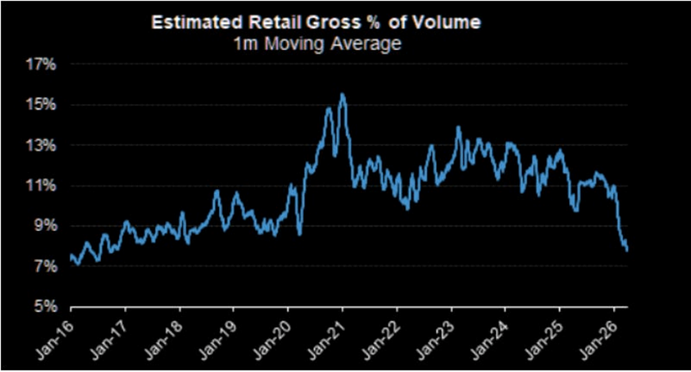 Chuyên gia từ ABS cũng chỉ ra một tín hiệu hỗ trợ khác đến từ hành vi của nhà đầu tư cá nhân tại Mỹ, khi tỷ lệ giao dịch đã giảm về mức 7 - 8% tổng thanh khoản, tương đương vùng thấp nhất trước đại dịch Covid-19.