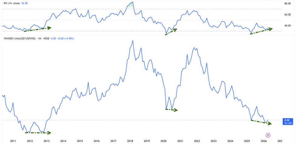 Trong bối cảnh giá vàng tăng mạnh, chỉ số VNI-XAU đã trở nên kém hấp dẫn trong thời gian qua. Chỉ số trên suy yếu là điều dễ hiểu. Điểm tích cực là chỉ số này đang có dấu hiệu hình thành phân kỳ tăng giá với các chỉ báo động lượng. Trong lịch sử, mô hình tương tự từng xuất hiện vào các giai đoạn 2012-2013 và năm 2020. Đây đều là những vùng đáy dài hạn quan trọng, qua đó cho thấy xác suất hình thành đáy trung - dài hạn đang tăng dần.