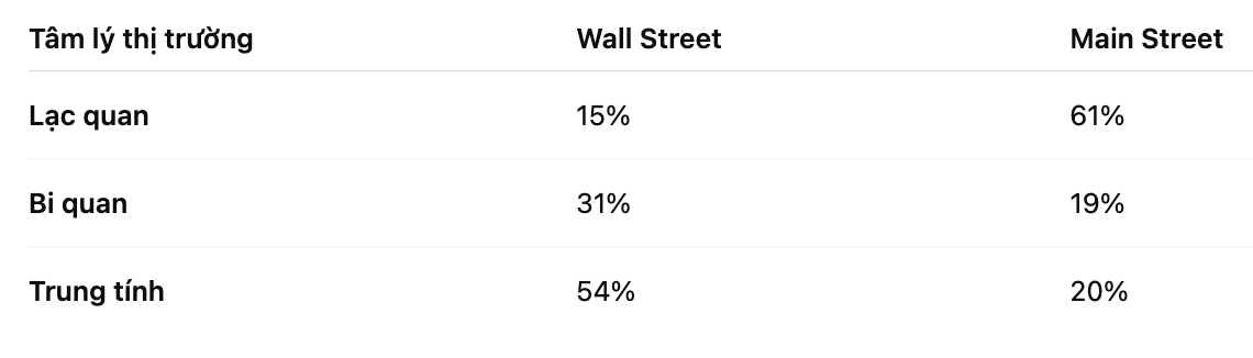 Khảo sát vàng hàng tuần mới nhất của một nền tảng thông tin tài chính quốc tế cho thấy, phần lớn giới chuyên gia Phố Wall chuyển sang quan điểm giảm giá hoặc trung lập, trong khi nhà đầu tư cá nhân vẫn duy trì tỉ lệ lạc quan chiếm đa số.