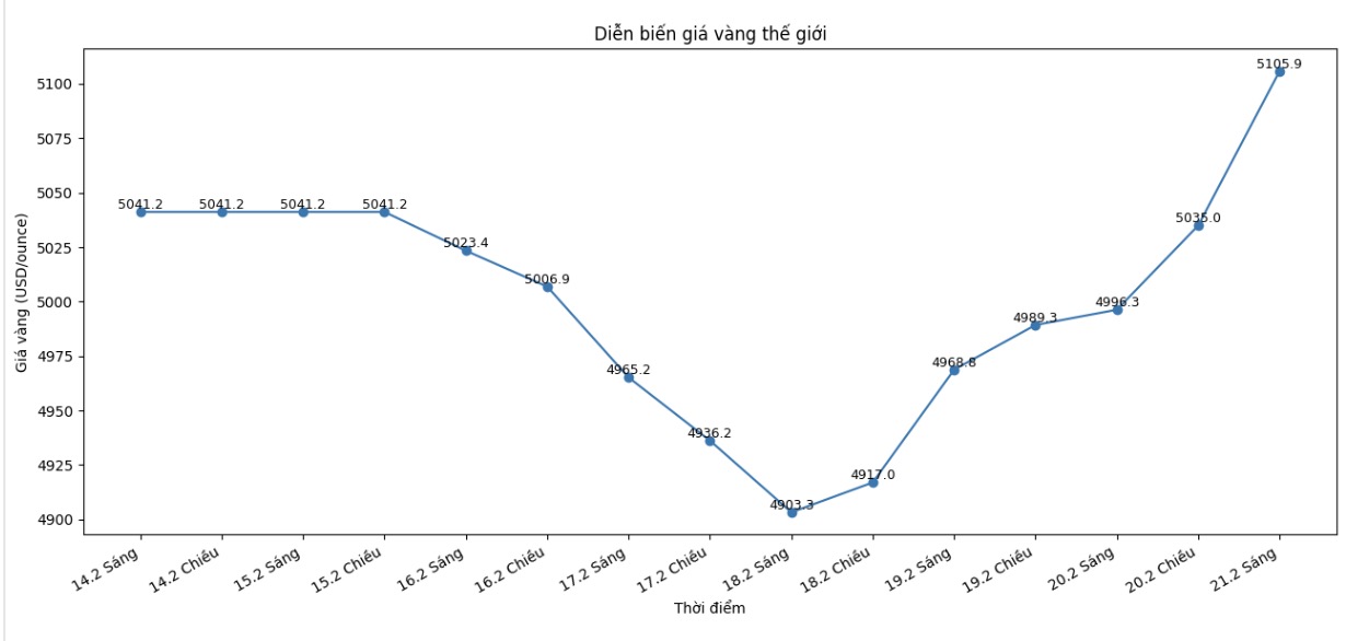 Giá vàng giao ngay mở đầu tuần ở mức 5.022,85 USD/ounce. Dù vậy, thị trường thiếu động lực rõ ràng trong giai đoạn đầu, khi giá vàng chật vật giữ mốc hỗ trợ 5.000 USD/ounce trong phiên giao dịch đêm Chủ nhật, trước khi chịu áp lực bán ngay sau 8h00 thứ Hai.