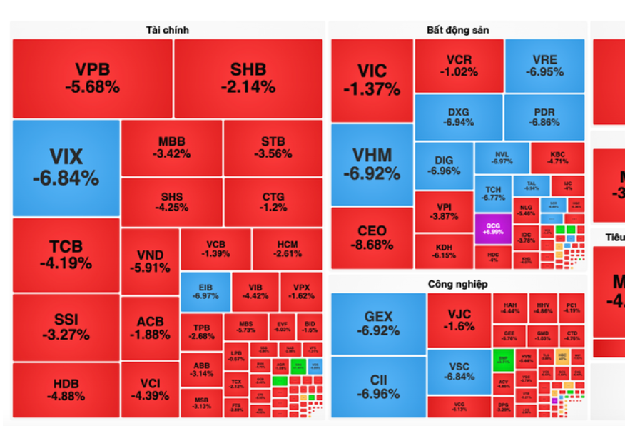 Thống kê cho thấy toàn thị trường có hơn 600 mã giảm giá, trong khi số cổ phiếu tăng chỉ chưa tới 200 mã. Mức điều chỉnh 3%-4% xuất hiện dày đặc, thậm chí không ít cổ phiếu vốn hóa lớn rơi vào trạng thái giảm sàn, cho thấy áp lực bán diễn ra quyết liệt và mang tính lan tỏa.