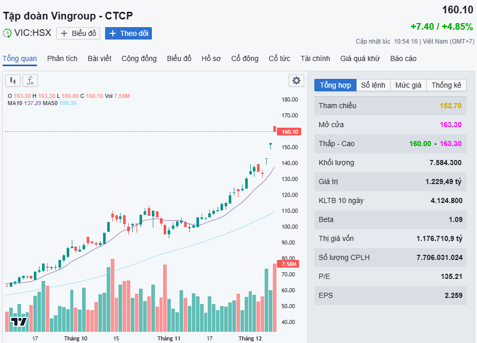 Xét các yếu tố này, công ty chứng khoán cho rằng giá cổ phiếu hiện tại (đã tăng gấp đôi trong 3 tháng qua) có thể đã vượt khá xa so với triển vọng lợi nhuận trong trung hạn. Đồng thời, Vietcap hạ khuyến nghị đối với từ phù hợp thị trường xuống bán. Kết thúc phiên giao dịch ngày 8-12, cổ phiếu VIC có mức giá 152.700 đồng/cổ phiếu.