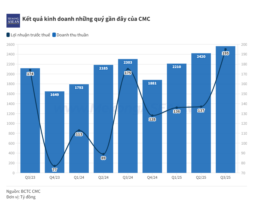 Kết quả, lợi nhuận trước thuế trong quý 3/2025 của CMC đạt 194,9 tỷ đồng, tăng 11,4% so với quý 3/2024. Đây là quý có doanh thu thuần và lợi nhuận trước thuế cao nhất từ trước đến nay của doanh nghiệp.