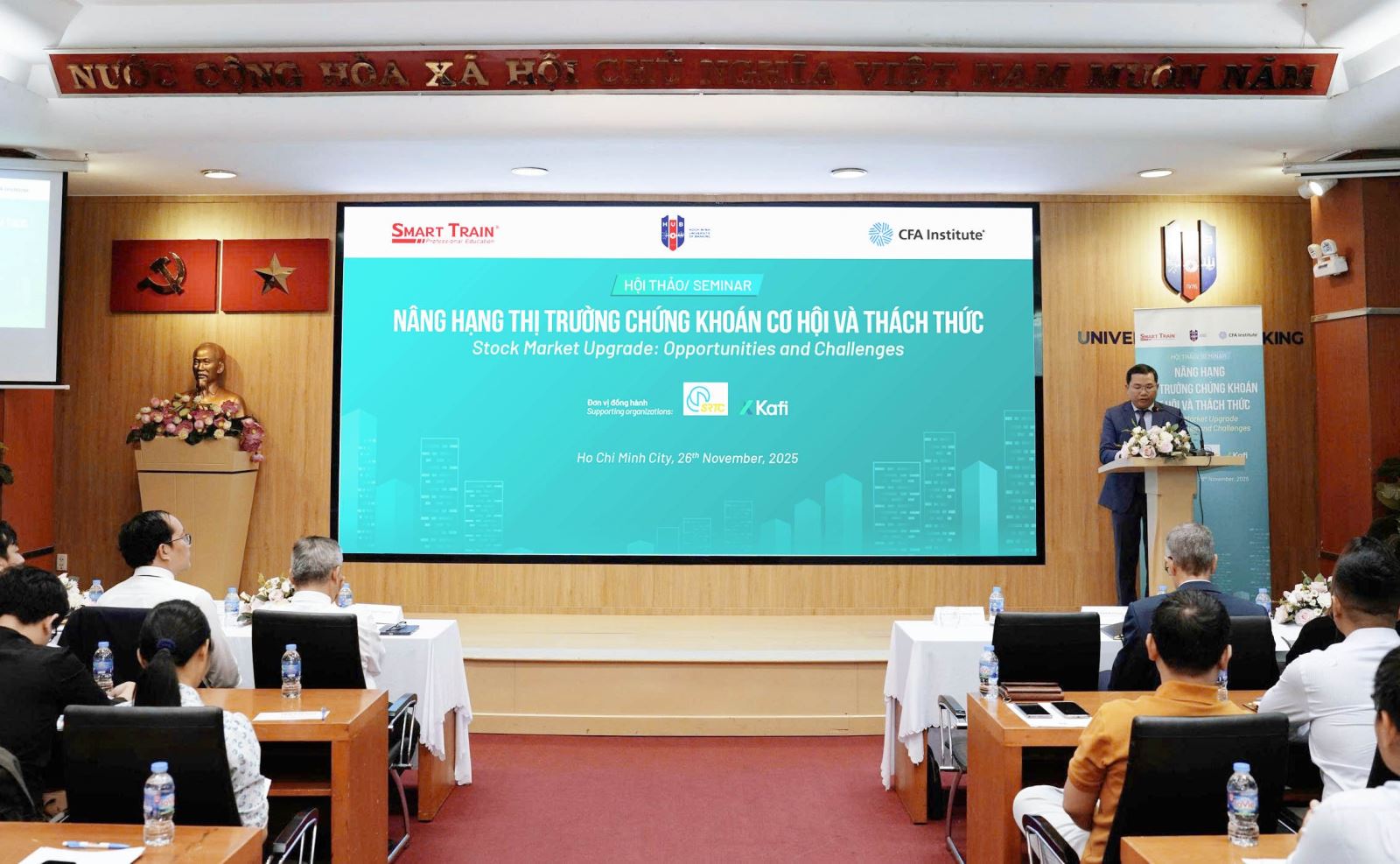 Ngày 26/11, Smart Train Academy phối hợp cùng CFA Institute, Khoa Tài chính, Trường Đại học Ngân hàng TP. Hồ Chí Minh (HUB) tổ chức hội thảo “Nâng hạng thị trường chứng khoán: Cơ hội và thách thức”, thu hút nhiều khách mời là doanh nghiệp niêm yết, công ty chứng khoán, tổ chức tư vấn, các trường đại học và cơ quan quản lý.
