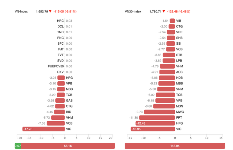 Kết phiên 9-3, thị trường chứng khoán Việt Nam trải qua một phiên lao dốc kỷ lục khi VN-Index mất hơn 115 điểm (-6,51%), lùi về 1.652,79 điểm.