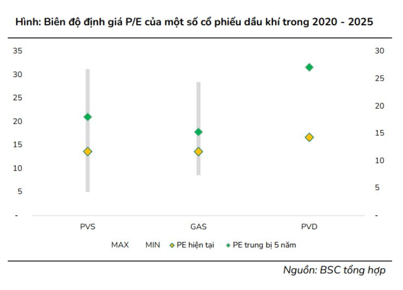Sang năm 2026, BSC cho rằng triển vọng giữa các doanh nghiệp sẽ có sự phân hóa. Những doanh nghiệp có backlog tốt, ký kết giá thuê tốt (PVS, PVD) vẫn duy trì được tăng trưởng, trong khi GAS sẽ gặp mức nền lợi nhuận cao của năm 2025 do hoàn nhập chi phí trong khi nguồn khí LNG chưa đủ bù đắp xu hướng giảm của khí tự nhiên. Đối với BSR năm 2026 có thể đối mặt với thách thức từ giá dầu thô giảm và biên crack thu hẹp, nhưng được hỗ trợ bởi sản lượng tiêu thụ tiếp tục phục hồi.
