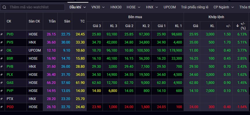 Nhìn rộng hơn, nhóm dầu khí đang chứng kiến đà tăng giá từ nửa sau tháng 10/2025. Chỉ sau khoảng 3 tuần, nhiều cái tên như PVD và PVS bật tăng lần lượt 37% và 24% giá trị, theo sau, GAS, OIL hay PLX sau cũng tăng khoảng 6%-10%.