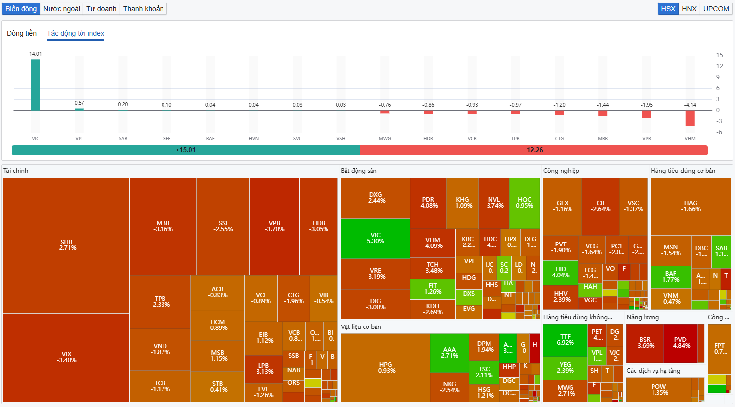 Dù VIC vẫn đang gồng gánh thị trường, áp lực bán lan rộng ở nhiều nhóm ngành khiến diễn biến trở nên tiêu cực. Bản thân VIC cũng đánh mất sắc tím trong sáng nay, trong khi nhóm bluechip (cổ phiếu của một công ty có độ uy tín cao, tình hình tài chính vững chắc và giá trị vốn hóa thị trường lớn) đồng loạt nới đà giảm: SSI, MWG, VJC, PLX, HDB, VPB, VHM, MBB giảm từ 2% đến gần 3%; LPB giảm hơn 5%.