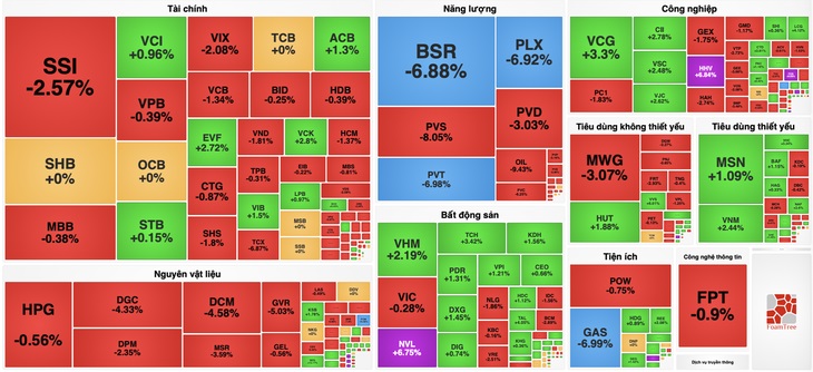 Nhóm chứng khoán cũng chịu áp lực điều chỉnh khi SSI giảm 2,57%, VIX giảm 2,08%, trong khi VCI tăng nhẹ 0,96%.