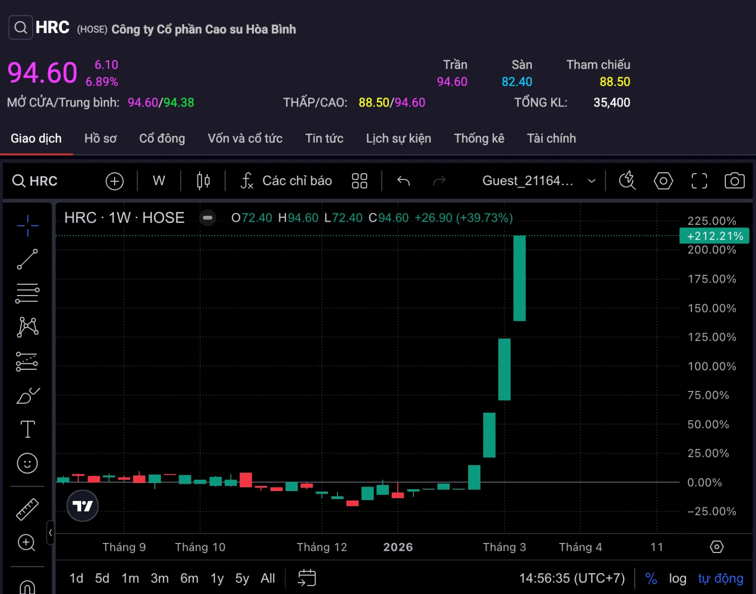 Theo dữ liệu giao dịch, cổ phiếu HRC vừa trải qua 14 phiên tăng trần liên tiếp trong giai đoạn từ ngày 24/2 đến ngày 13/3. Chỉ trong khoảng thời gian chưa đầy ba tuần, thị giá cổ phiếu đã tăng mạnh từ 37.050 đồng/cổ phiếu (giá đóng cửa phiên 23/2) lên 94.600 đồng/cổ phiếu vào cuối phiên 13/3. Tính từ đầu tháng 2, cổ phiếu này đã có tổng cộng 16 phiên tăng trần.