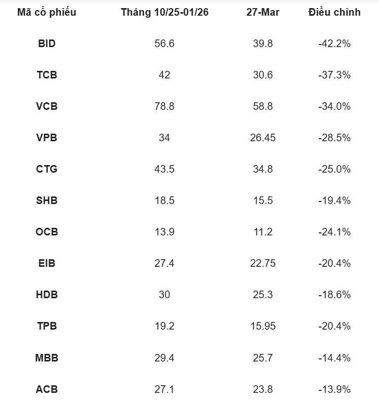 Nhóm cổ phiếu ngân hàng, vốn là lực đỡ quan trọng của thị trường chứng khoán, đang trải qua nhịp điều chỉnh đáng chú ý khi bước sang quý I/2026. Thống kê đến ngày 27/3 cho thấy, phần lớn các mã ngân hàng đã giảm sâu so với vùng đỉnh thiết lập trong giai đoạn từ tháng 10/2025 đến tháng 1/2026.