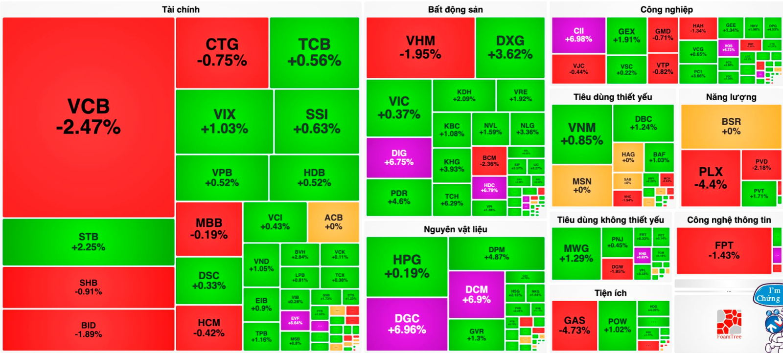 Các nhóm công nghiệp, tiêu dùng và năng lượng giao dịch đan xen xanh – đỏ. Nhóm năng lượng kém tích cực với PVS -2,9%, PLX -4,4%, trong khi BSR đứng giá và POW +1,02%. Ở nhóm tiêu dùng, sắc xanh xuất hiện tại VNM +0,85%, DBC +1,24%, MWG +1,29%, PNJ +0,45%, trong khi MSN giữ giá. Nhóm công nghiệp ghi nhận một số điểm sáng như CII +6,98%, GEX +1,96%, trong khi GMD -0,71%.