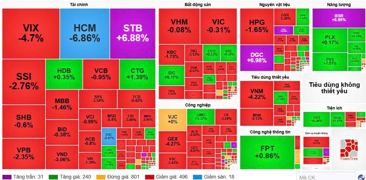 Ở nhóm ngân hàng, sắc đỏ vẫn chiếm ưu thế với VCB -0,95%, BID -0,38%, TCB -0,42%, VPB -2,35%, MBB -1,46%, ACB -0,8%, SHB -0,6%, VIB -1,39%,… Tuy nhiên ngoài STB còn có CTG +1,39%, LPB +1,42% và HDB +0,35%, góp phần hạn chế đà giảm chung.