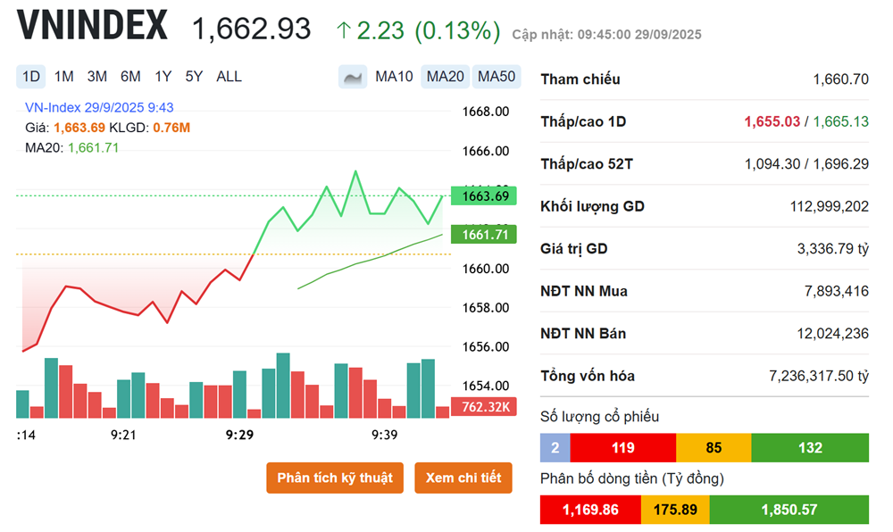 9h30: Thị trường giao dịch giằng co và bật tăng lên mức 1.663, tăng hơn 3 điểm nhờ sự dẫn dắt của nhóm midcap. Sắc xanh chiếm ưu thế với 258 mã tăng, trong khi có 208 mã giảm.