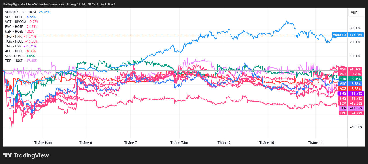 Theo quan sát của Nhadautu.vn, nhiều cổ phiếu xuất khẩu cho đến phiên giao dịch 21/11 vẫn chưa quay trở lại vùng giá trước sự kiện thuế quan (tức phiên 2/4). Có thể thấy, đồng loạt các cổ phiếu thủy sản như VHC (-7,01%), FMC (-25,1%), nhóm dệt may với TCM (-14,81%), TNG (-10,91%), STK (-3%), hoặc nhóm gỗ với TDP (-14,81%), ACG (-8,33%)…