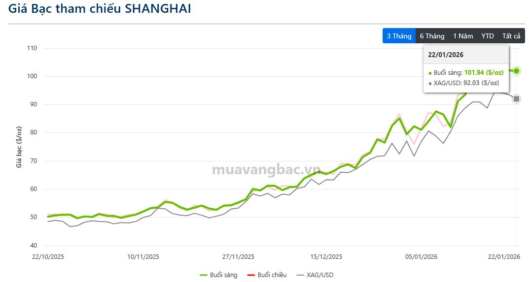 Cập nhật sáng ngày 22/1, giá bạc vật chất tại Thượng Hải điều đỉnh nhẹ về 101,94 USD/ounce, tương ứng giảm khoảng 2,36 USD/ounce so với đỉnh hôm 20/1. Tuy nhiên, mức giá này vẫn cao hơn đáng kể so với giá bạc giao dịch trên sàn COMEX (Mỹ), hiện quanh 92 USD/ounce, tương đương chênh lệch gần 10 USD/ounce. Khoảng cách này đã tăng bằng lần chỉ trong vài tuần.
