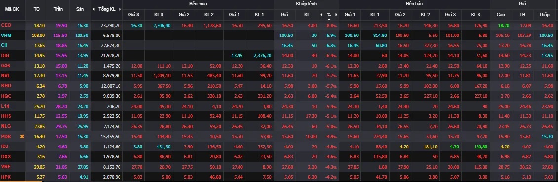 Trong khi nhóm dầu khí, năng lượng, hóa chất, khoáng sản, cao su,… tăng mạnh thì nhóm chứng khoán, ngân hàng, bất động sản,… đỏ lửa. Đáng chú ý nhất là nhóm bất động sản, hàng loạt cổ phiếu giảm sàn như VHM, DRH, HDC, FIR,… hoặc gần sàn như DIG, TAL, NVL, KHG, NLG, PDR,…