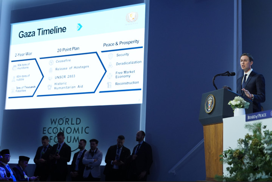 Ông Jared Kushner phát biểu sau lễ ký hiến chương Hội đồng Hòa bình tại Hội nghị thường niên Diễn đàn Kinh tế Thế giới (WEF) ở Davos, Thụy Sĩ, ngày 22/1/2026. (Ảnh: AP/Evan Vucci)