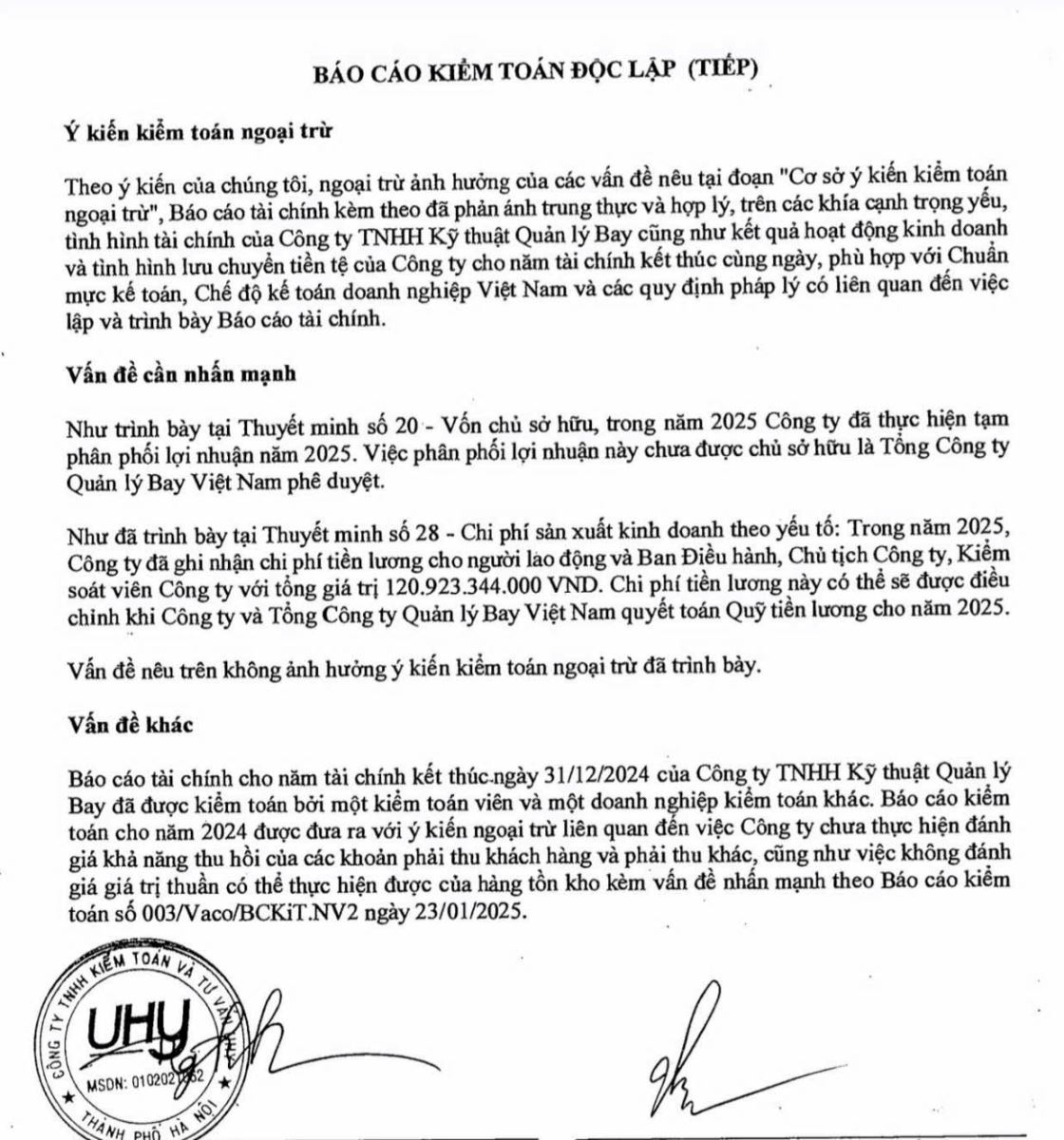 Ngoài ra, Công ty TNHH kiểm toán và tư vấn UHY nhấn mạnh: Tại Thuyết minh số 20 - Vốn chủ sở hữu, trong năm 2025 Công ty đã thực hiện tạm phân phối lợi nhuận năm 2025. Việc phân phối lợi nhuận này chưa được chủ sở hữu là Tổng Công ty Quản lý Bay Việt Nam phê duyệt.