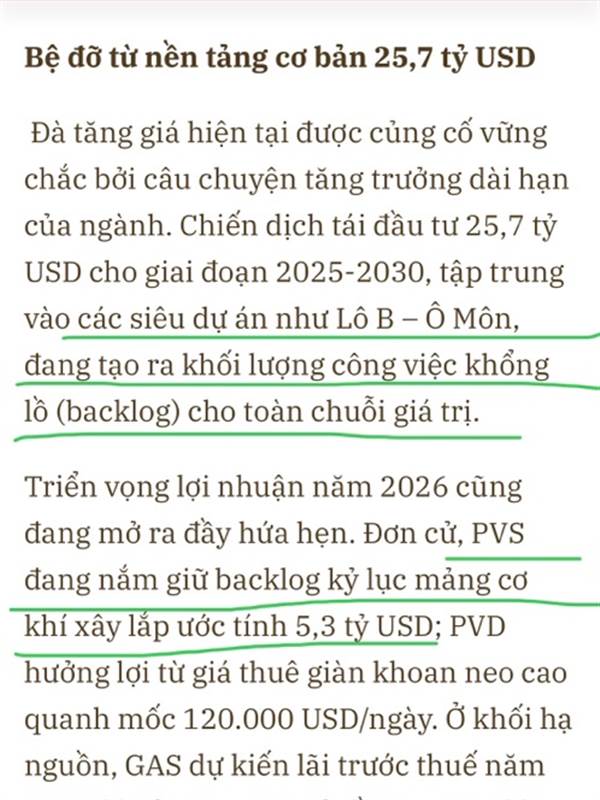 Thứ hai, dầu khí (PVD, PVB, BSR, PVS): Năm 2026, ngành dầu khí bước vào pha tái tăng tốc nhờ hai lực kéo chính: (1) khung pháp lý hoàn thiện hơn, tăng minh bạch; (2) an ninh năng lượng trở thành ưu tiên khi nguồn cung nội địa suy giảm, khiến các dự án lớn phải đẩy nhanh tiến độ: Lô B – Ô Môn bước vào cao điểm EPC, Lạc Đà Vàng dự kiến vận hành giàn xử lý từ Q3/2026 và hướng tới đón dòng dầu đầu tiên Q4/2026. Đồng thời, LNG theo Quy hoạch điện VIII thúc đẩy đầu tư hạ tầng khí, kéo nhu cầu dịch vụ dầu khí phục hồi.